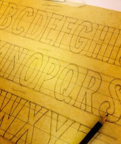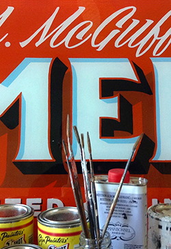 Extended warped Tuscan lettering with a perspective shade. Pencil to brush, all hand done and no computers involved! Reverse painted on salvaged glass.